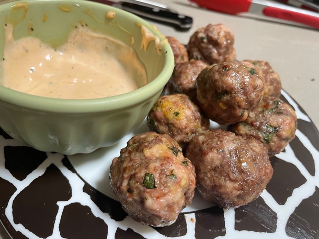 I roll these cuties into petite meatballs and put them on a wire rack over a cookie sheet and bake them for about 15 minutes at 350 degrees.