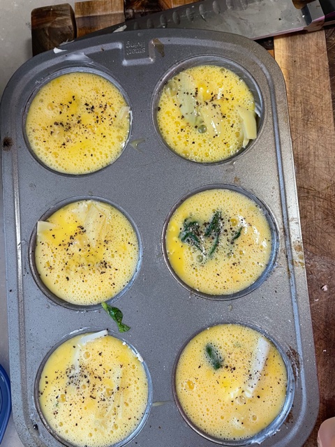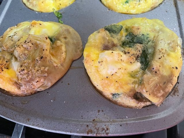 I cook the mini-quiches in a cupcake tin. I put whatever fillers I’m using (these were filled with spinach, feta, olives and artichoke hearts) into a buttered cup then top off with scrambled raw egg. Bake for 20 minutes until egg is cooked through and serve immediately.