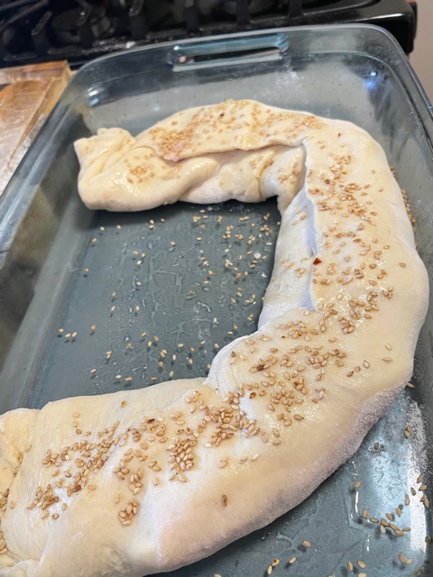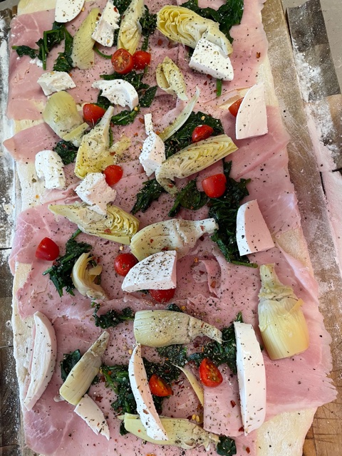 Stromboli is super fun to make. You can use any ingredients that you have on hand and you can make it either sweet or savory. The one I made today used only half a pizza dough (from our local pizzeria) and was topped with ham, mozzarella, artichoke hearts, spinach and cherry tomatoes. Bake for about 40 minutes, cut and serve!