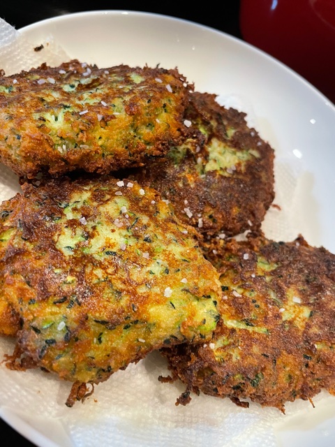 I never made the zucchini fritters before. What I did was grate up two zucchinis using my food processor (you could also use a box grater). I set the grated zucchini in a bowl, salted in and let it sit for an hour (the salt draws out the water). I then squeezed handfuls of the zucchini to get any residual water out and placed back in a dry bowl. I added seasoning (salt, pepper, minced garlic and 1/2 packet of Sazon – I’d love to add some parmesan to this, but the husband…), one egg and enough almond flour to bind the mixture. I pan fried the fritters, but you could also bake in the oven. They came out great. You can serve with a little tzatziki or even ranch dip on the side.
