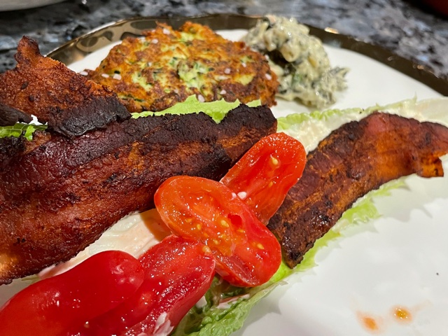 We needed a quick low carb dinner after a long day, followed by a walk to the beach to see a gorgeous sunset. We wound up making zucchini fritters and BLTs on lettuce wraps. Delicious and low carb.
