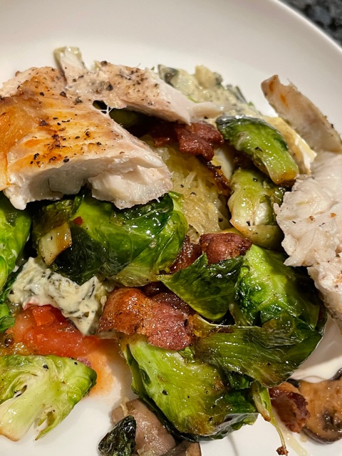 I served this the other night over a bed of sautéed Brussel sprouts with bits of pre-cooked bacon tossed in with crushed grape tomatoes on the bottom layer.