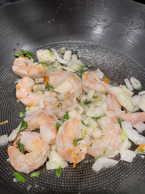 Now, back to your wok or sauté pan. Add a little EVOO, when warm add some fresh minced garlic and either fresh chopped onion or scallion and cook for about 3 minutes. Add fresh, cleaned shrimp and sauté until just pink. I usually have mint & basil growing on the patio, so I would mince some up and toss in towards the end of cooking.