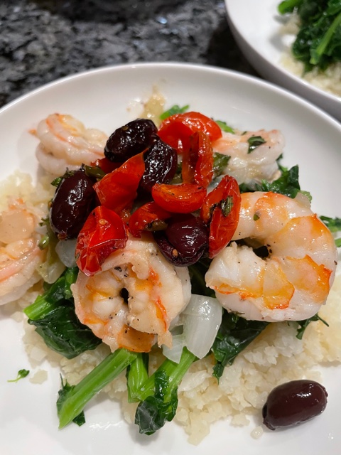 To plate this dish: I served it over cauliflower rice, so I plated that first, topped with shrimp, then with the baked tomato concoction. It was delicious, easy, hearty and a dish that I will definitely make again.