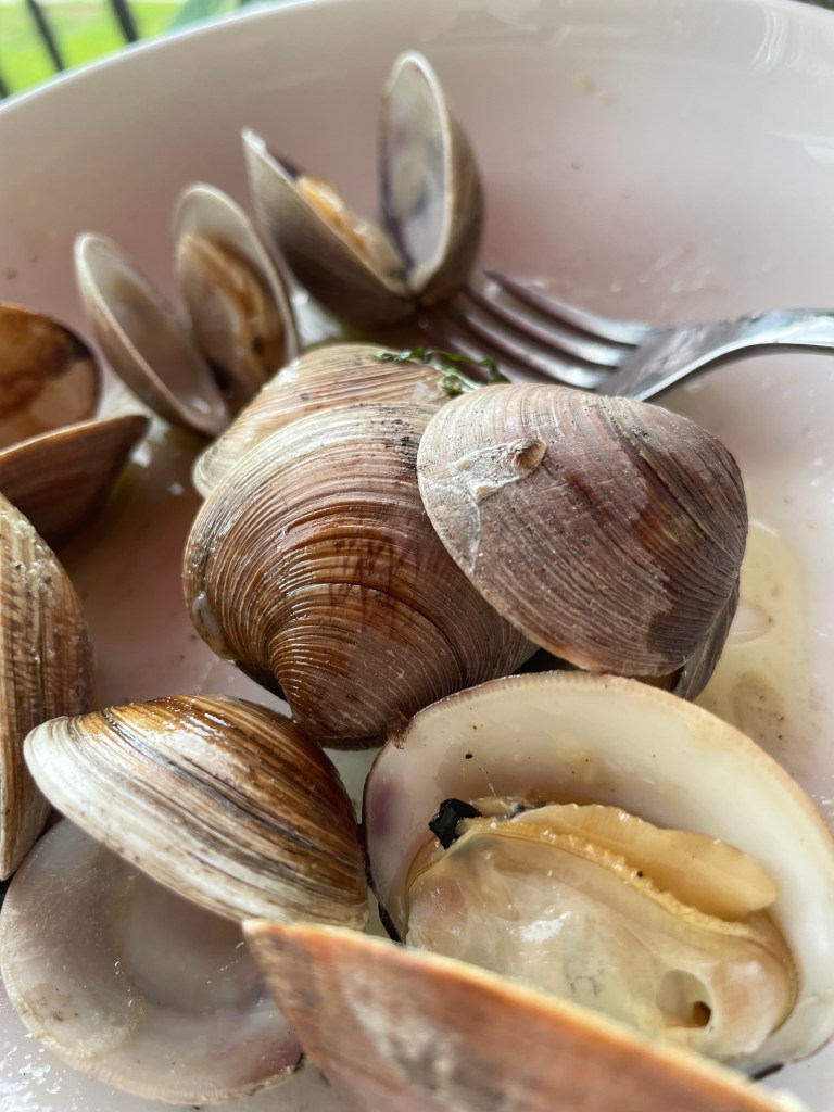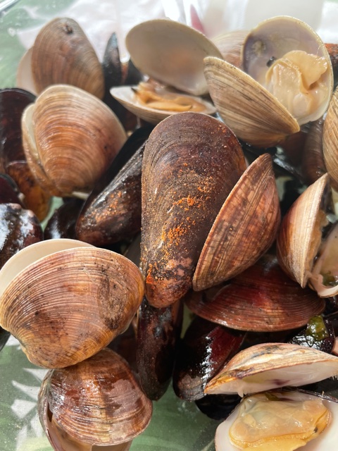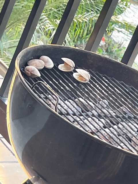 For the clams, I soak them for a while in just fresh water (no need to add flour, as I’ve read). Soaking them helps them to release any sand that they may be holding onto. When you’re ready to cook them lift them from the bowl (rather than dumping the bowl) leaving the sandy water behind. Rinse and then put in fresh bowl while escorting them to the BBQ. Hubby makes a concoction of butter, a whole (not chopped) clove of garlic, juice from 1 lemon and chopped cilantro) that he melts in a small heat resistant dish on the BBQ. Great dipping for either clams or mussels or even shrimp!