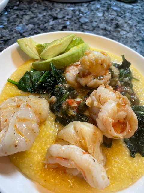 Now to plate this baby. Spoon polenta on the plate, top with shrimp and a helping of the broccoli rabe. I garnished with fresh avocado. You can drizzle with EVOO and viola!