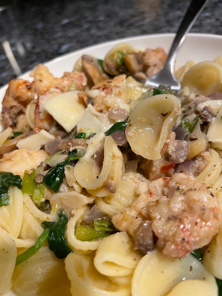 Last night was a quick orecchiette, with sautéed spinach, tons of crushed garlic cloves and red Argentinian shrimp from Trader Joes (sometimes I just don’t feel like going to the fish monger, and these tasty, frozen shrimp are a great Plan B). First get your salted water boiling for the pasta. While this is happening sauté fresh crushed garlic and the shrimp in a little EVOO until shrimp are mostly cooked, then add spinach until cook until wilted (use a large sauté pan as you’ll add the pasta when it’s cooked). When water is rapidly boiling add your pasta cook for 9-10 minutes (or until it’s cooked al dente). Save about a cup of the starchy water and strain the pasta. Add pasta to sauté pan with shrimp, garlic and spinach adding the water if you need to loosen up the mixture. Keep heat on low and mix until well incorporated.