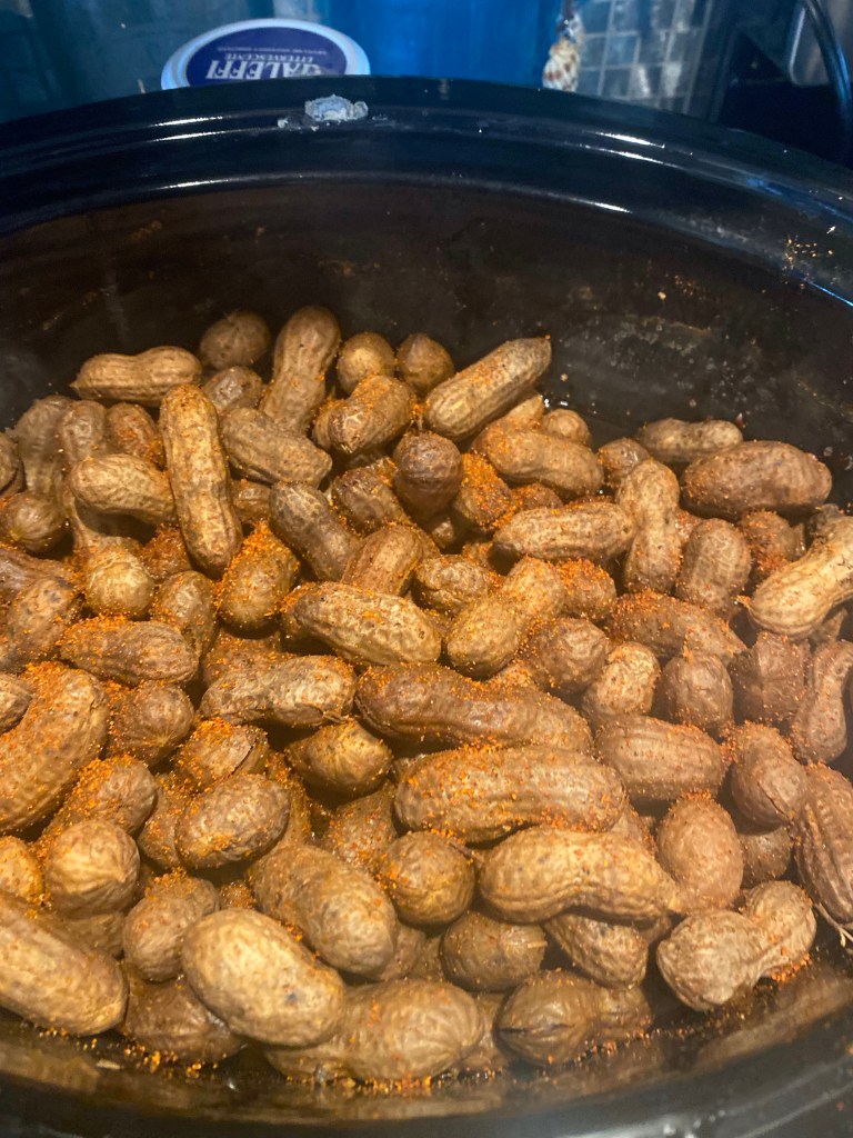 So, after some research, this is what I did. I bought a 2 pound bag of raw peanuts, which I tossed into the crockpot with 10 cups of water and bunch (like 1/4 of a cup) of this newly discovered spicy seasoning, “Slap Ya Mama” (sorry Mom!)