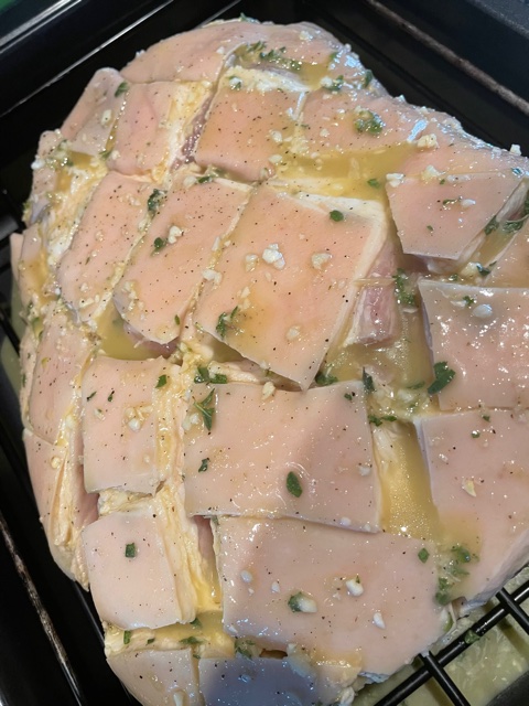 Now for the magic, using a sharp paring knife I stab several deep holes (while channeling a dark, serial killer persona) in the meat-not on the skin side-where I will place cloves of garlic deep inside to infuse the pork with flavor. Next, using a super sharp knife, I carefully cut long lines about 1 inch apart from each other across and through most of the fat layer (to the point where the skin meets the meat) and do the same on the bias to create a hatch pattern. (See pic below.)