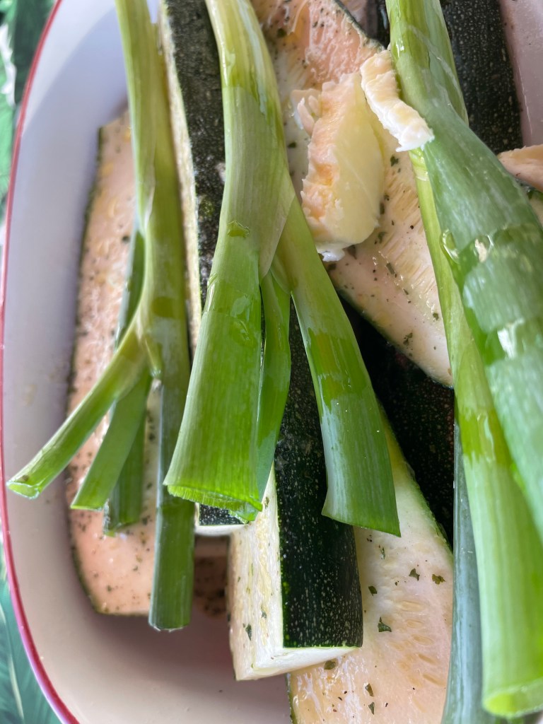 The veggies are fresh sliced zucchini with EVOO and a little ranch (powder) dressing sprinkled all over. The scallions were just trimmed (roots and tippy tops cut off) with a little drizzle of EVOO.