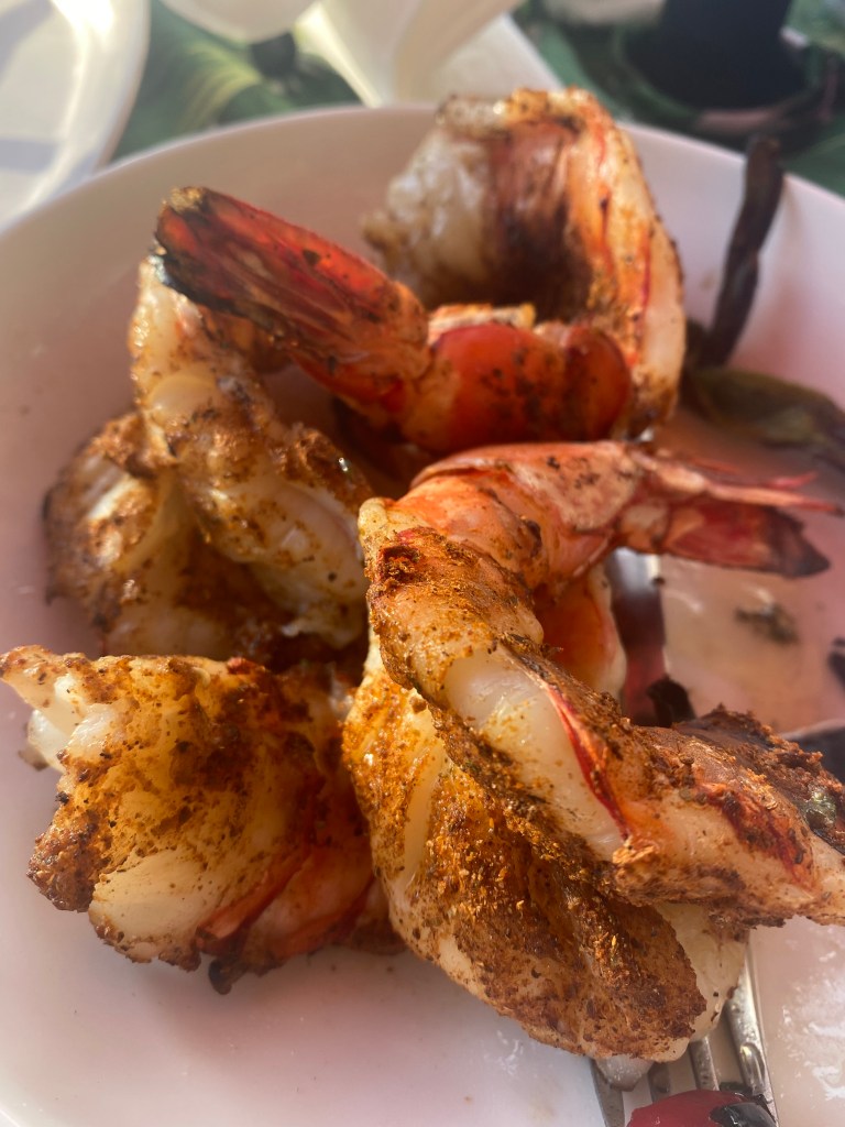 We are lucky to have a great fish monger nearby. For this BBQ, I butterflied colossal shrimps and blackened them. I just sprinkled blackening seasoning over them after butterflying and that’s it! I like the Old Bay Blackening Seasoning.