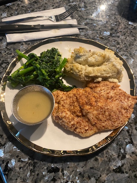 I plated the mashed first, topped with the chicken cutlet, topped with lemon sauce and broccoli rabe on the side. My husband plated his differently LOL.