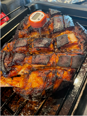 I put this bad boy on a v-rack in my oven skin side down for two hours at 150 degrees. After two hours I flip it so the skin side is now facing up and cook for another two hours at 150 degrees. This piece of meat was about 5 pounds so you may need to adjust your cooking time depending on the size of pork you have. If you have a meat thermometer your inside temperature (which you take after the pork has rested outside of the oven for about 3-5 minutes) should be 145 degrees. (A useful meat temperature guide can be found here.) After resting I turn it over to hubby, who harnesses his inner caveman and carves this beauty up.