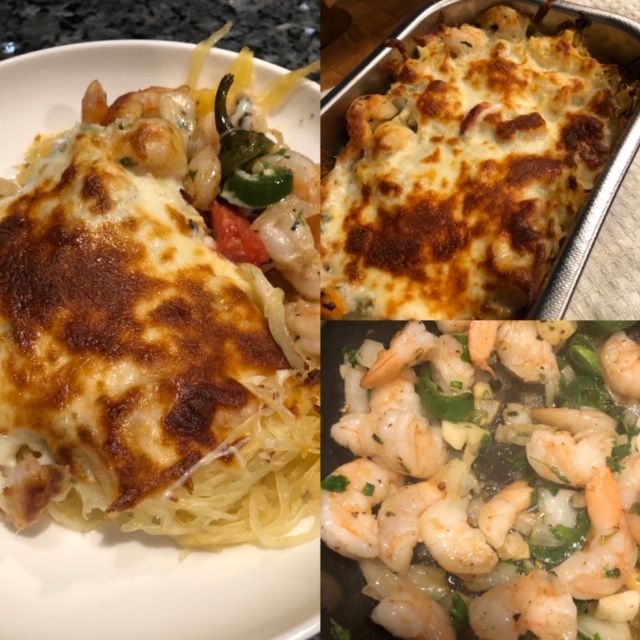 To make this beauty cut a spaghetti squash in half, seed it, brush the cut side with a little EVOO, season it with salt & pepper and bake it, cut side down, for about 30 minutes in a 350 degree oven. While that magic is happening, quickly sauté some fresh shrimp, garlic, onion, spinach and season well (I like to add some red pepper flakes or diced up jalapeño just to spice it up). Next step, when the squash has cooked and is cool enough to handle scrape it out into the wok with the shrimp sauté. Mix the squash and shrimp well so it’s all incorporated. Then turn the mixture into a baking pan that is lightly brushed with EVOO (to prevent sticking). Top this with mozzarella and bake for about 20 minutes in a 350 oven (until cheese is melted and a little brown).
