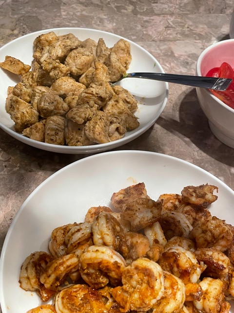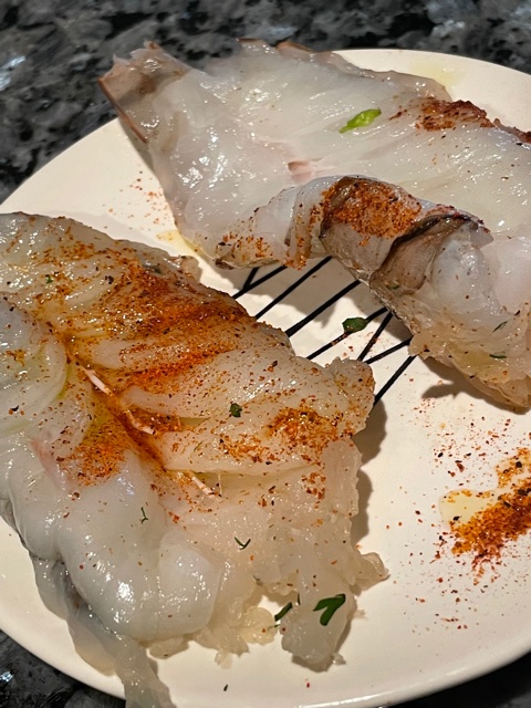 For this meal I had some amazing, colossal shrimp which I butterflied and seasoned with EVOO, pepper, and Slap ya Mama. I also had sushi grade tuna which I cubed (large cubes) and dredged in black pepper.