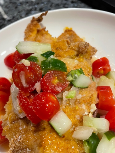 Last night’s dinner was a go-to for us. Chicken cutlet with bruschetta. My bruschetta changes depending on what looks fresh in the produce department. I was lucky enough to be in Astoria the other day and shopped at my favorite grocery store (shout out to Berry Fresh on Ditmars). So for this bruschetta I incorporated fresh cucumbers, dill, tomatoes, red onion, chopped Greek olives, a fabulous feta cheese and a good quality EVOO. I mix this all together with a little kosher salt & pepper and let it get cozy in the fridge for about an hour so that all the flavors come together. Take it out of the fridge about 20 minutes before serving.
