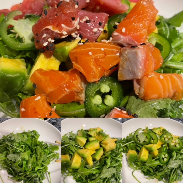 This dish has been a fun go to that I’ve posted before. Search the site for the how to’s. Each time I make this, I change it up a bit this one was a base of arugula with jalapeños, avocado, salmon & tuna topped with a few sesame seeds. Super fresh, satisfying and low carb!