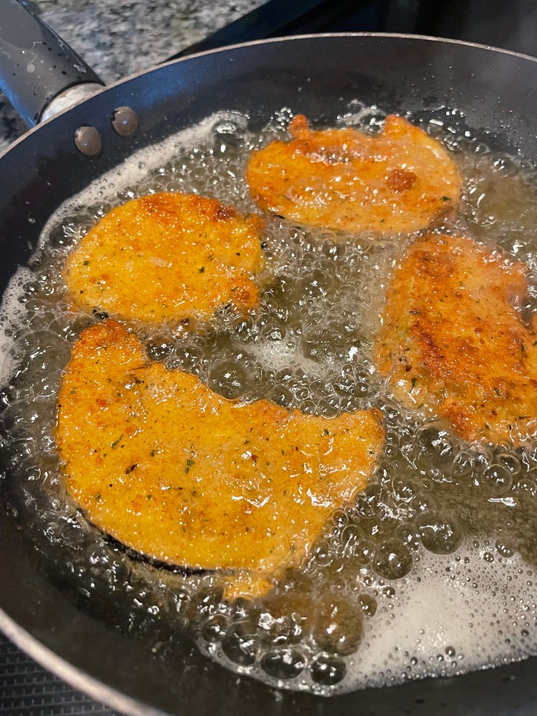 This is what happened last night: First I seasoned (salt & pepper) the thin cutlets, then I dredged them in almond flour (shaking off any excess) and pan fried them in my wok (I used less than 1/2 inch of oil – I don’t deep fry) or you can cook them in the oven at 350 degrees for about 20 minutes (timing will depend on the thickness). When cooked I place them on a serving dish lined with paper towels to rest while I prepare the rest of dinner.