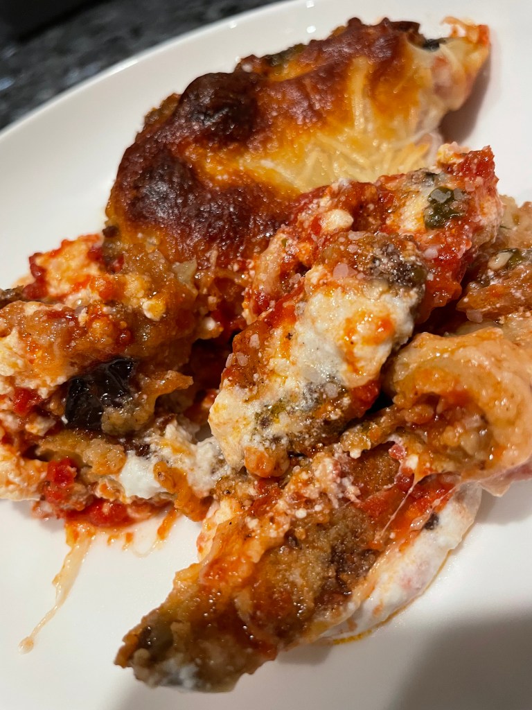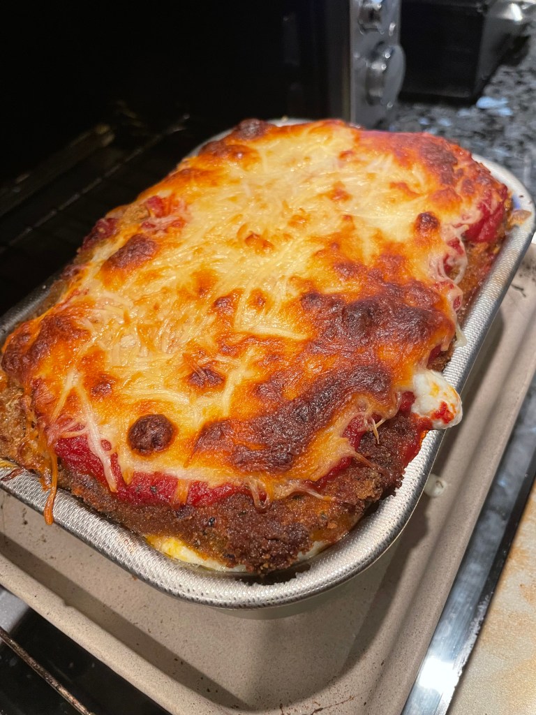 The only time I will ever use a jar sauce is for pizza or parm. My Sunday sauce is too rich (due to all the pork and beef that I add). The richness would take away from the flavor of the eggplant. That said, the sauce that worked for this is Michael’s of Brooklyn.