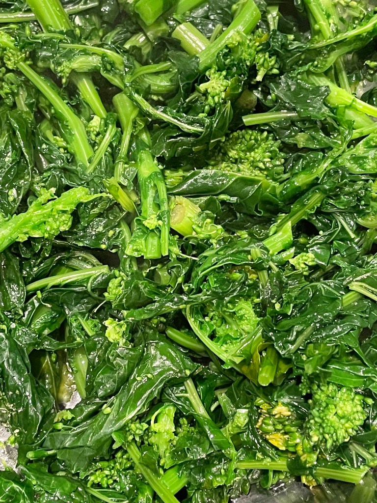 Pro-tip: when you steam the broccoli rabe add a bullion cube to the boiling water, this takes the bitterness out of the broccoli rabe. Also, I drain the cooked broccoli rabe then quickly sauté it with a little garlic, salt, pepper and crushed red pepper flakes (just long enough to incorporate all the spices).