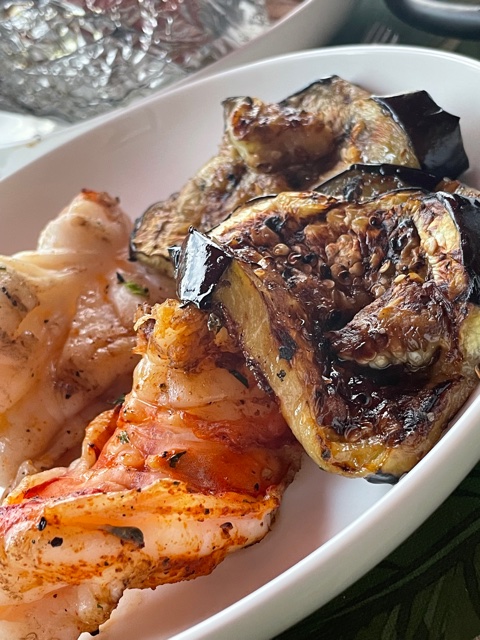 I served grilled eggplant with the shrimp. To do this, first peel the eggplant, leaving some strips of peel on the fruit. Then simply slice the eggplant in circles, about 1/4 inch thick. Brush with EVOO and season with salt & pepper. Throw the eggplant on the grill about 5 minutes before the shrimp and remove when they are tender and charred. The center will be soft and very tasty.