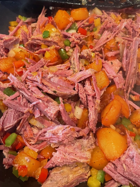 I will say upfront that I did not make this delicious corned beef hash, this was all the hubby (except for the poached eggs, which I whipped up). Corned beef hash is one of those dishes that you can really modify to your liking. In his recipe he uses (obviously) a corned beef, which he cooks overnight in the crockpot (could that be easier?) Just add water and spices, and set up crockpot – 8 hours low). Then he sautés cubed potatoes, onions, carrots, green, red and yellow peppers seasoned with salt, pepper, sazon. Once these goodies are cooked through, he mixes in the shredded corned beef. That’s it! You can top this with eggs, any way you like them, hollandaise sauce or salsa.