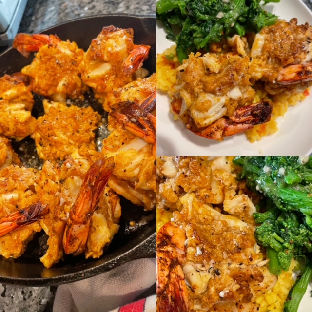 Like always, the freshest, best quality ingredients pay off. I used colossal sized shrimp and fresh, whole lump crabmeat. I assembled and cooked in my old standby cast iron skillet and served over rice with a side of broccoli rabe.