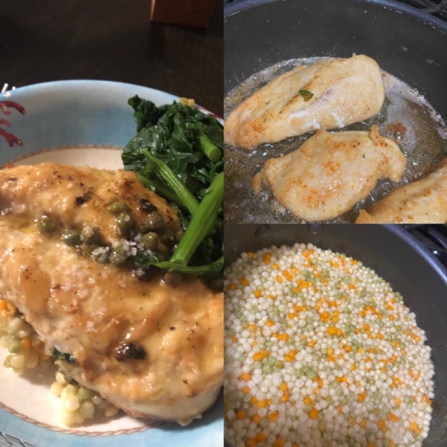 I butterflied the cutlets so they were not too thick. Season with salt & pepper. Dredge cutlets in flour. Heat 1 cup of canola oil in sauté pan. Add cutlets to pan cook about 5 minutes per side (check to make sure cutlets are cooked through). Remove cutlets from pan and place on wire rack. Take the juice from 4 or 5 lemons and add to pan (if there’s more than 1/4 cup of oil left in pan remove excess before adding lemon juice). Add 2 tablespoons of butter, season with salt and pepper and add 1/4 cup of capers to pan. Heat through and return cutlets to pan. Spoon lemon sauce over cutlets to make sure they’re all covered.