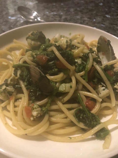 Pro-tip: I sometimes use lobster tail, flounder, grouper – buy what looks freshest and prepare in the same way. - Put your pasta in rapidly boiling water (we like a Barilla Bucatini – it’s a thick spaghetti with a hole in the center – but fettuccini, spaghetti or whatever you like will work). Cook until al dente (about 9 minutes – do a taste test – you can always cook it more, you can’t cook it less…) Using a spaghetti scoop put pasta in saucepan with seafood mixture adding water from the pasta pot as necessary to create the thickness of sauce that you want (we like about 2-3 scoops of pasta water).