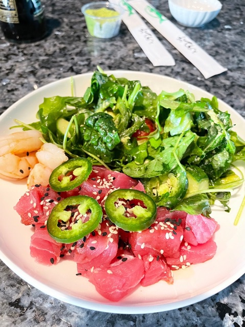 You really need a fish monger you can trust when buying sushi grade fish (in today’s case it was tun and salmon). This dish was so easy and quick. First I prepared a salad of arugula, spinach, avocado and very thinly sliced jalapeño, dressed with a little EVOO balsamic, salt & pepper. Then I cubed up my tuna & salmon. I dressed the fish up with a little low sodium soy and black & white sesame seeds. I plated this with the salad on one side of the dish and the fish on the other topped with a little more sliced jalapeño and a side of both pickled ginger and wasabi.